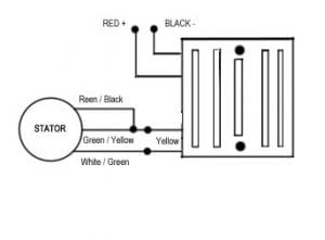 If you have 12 volt 2 wire stator simply connect the White / Green wire and the Green / Yellow wire to either of the yellow AC wires of your SPARX box. The Red + and Black – then simply connect to your motorcycle wiring. ( see diagram below)